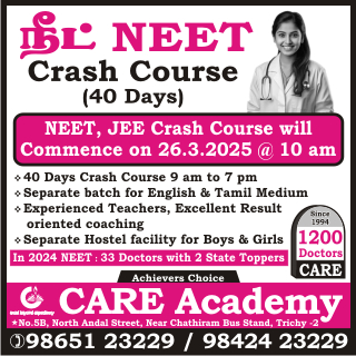 Best coaching centre in Tiruchirappalli Crash course for NEET, JEE will commence on 26th March, 2025