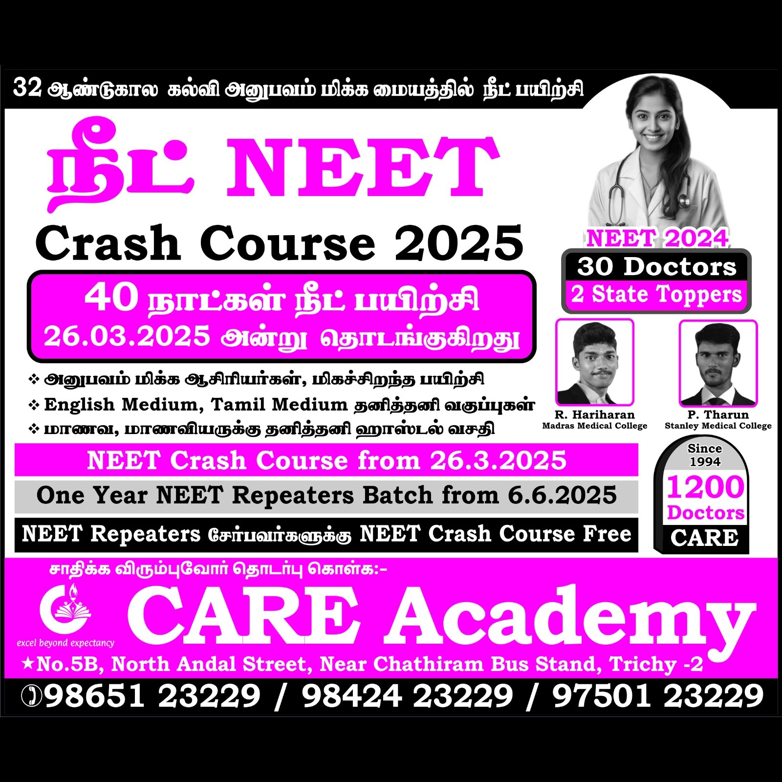 Care Academy Our NEET classes in Trichy are meticulously designed to provide students with a strong foundation and advanced strategies for cracking the NEET examination. We offer engaging lectures, comprehensive study materials, and regular assessments to track progress. Our experienced educators focus on building conceptual understanding, problem-solving skills.