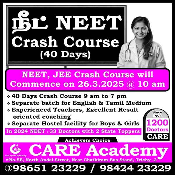 NEET Classes Trichy Care Academy Our NEET classes in Trichy are designed to offer a solid foundation for students aiming to pursue careers in medicine. Led by experienced faculty members, our classes incorporate interactive teaching methods, visual aids, and regular assessments. Whether you are a beginner or looking to enhance your performance