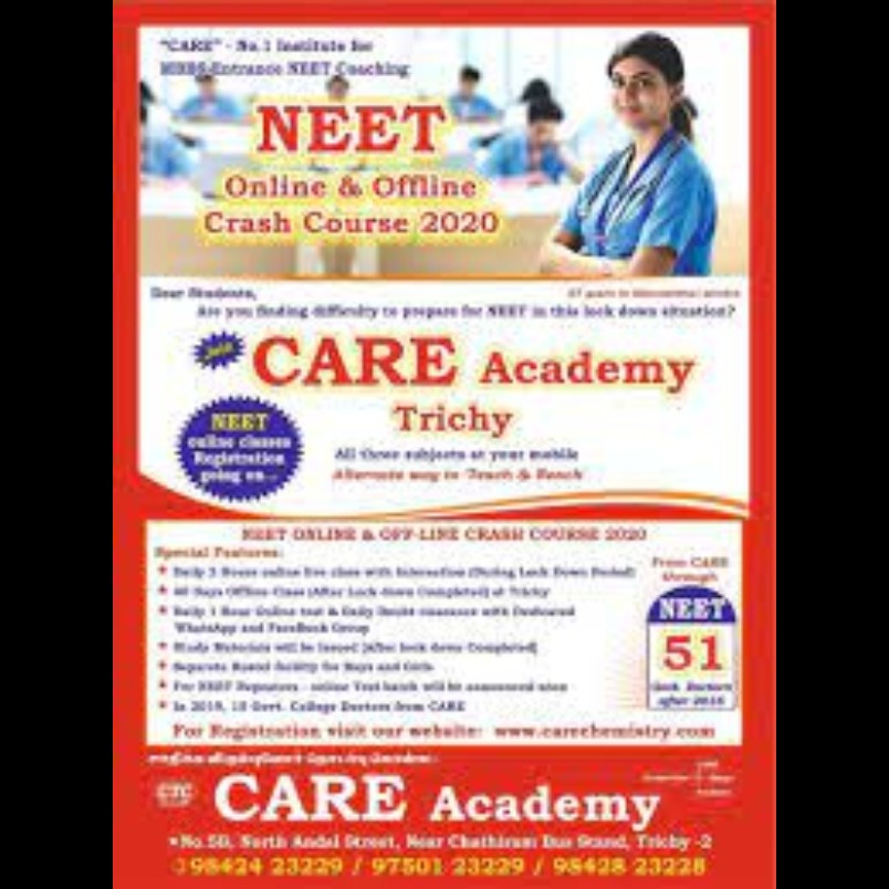 Care Academy We offer comprehensive and result-oriented coaching for the National Eligibility cum Entrance Test (NEET). Our expert faculty, with years of experience in NEET preparation, provides in-depth conceptual clarity in Physics, Chemistry, and Biology. Our structured curriculum, regular mock tests, and personalized doubt-solving sessions are designed to help students maximize their scores and secure admission to top medical colleges.