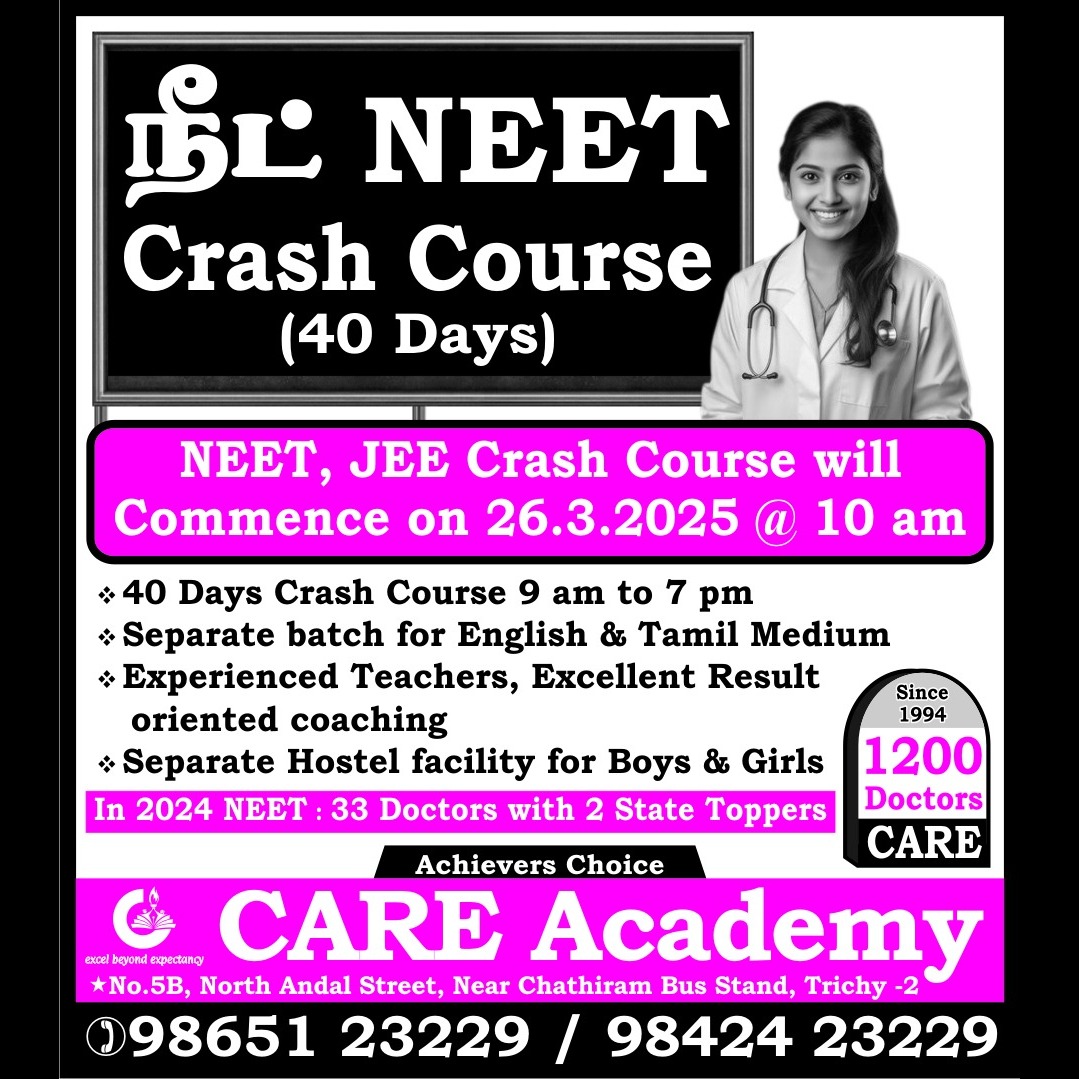 Care Academy For students aiming to improve their previous NEET scores, our NEET repeater coaching centre in Trichy offers a specialized and focused program. We understand the unique needs of repeaters and provide a renewed approach to preparation. Our curriculum emphasizes conceptual clarity, advanced problem-solving techniques, and rigorous practice.