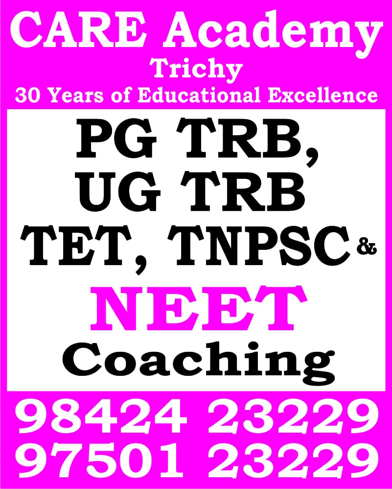 PG TRB coaching centre in Puthur Care Academy We provide comprehensive coaching tailored to the PG TRB syllabus, ensuring in-depth subject knowledge and exam readiness. Our expert faculty, with their extensive experience, deliver focused lectures, conduct regular tests, and provide personalized feedback. We are the leading PG TRB coaching center in Trichy, dedicated to helping you achieve your career goals.
