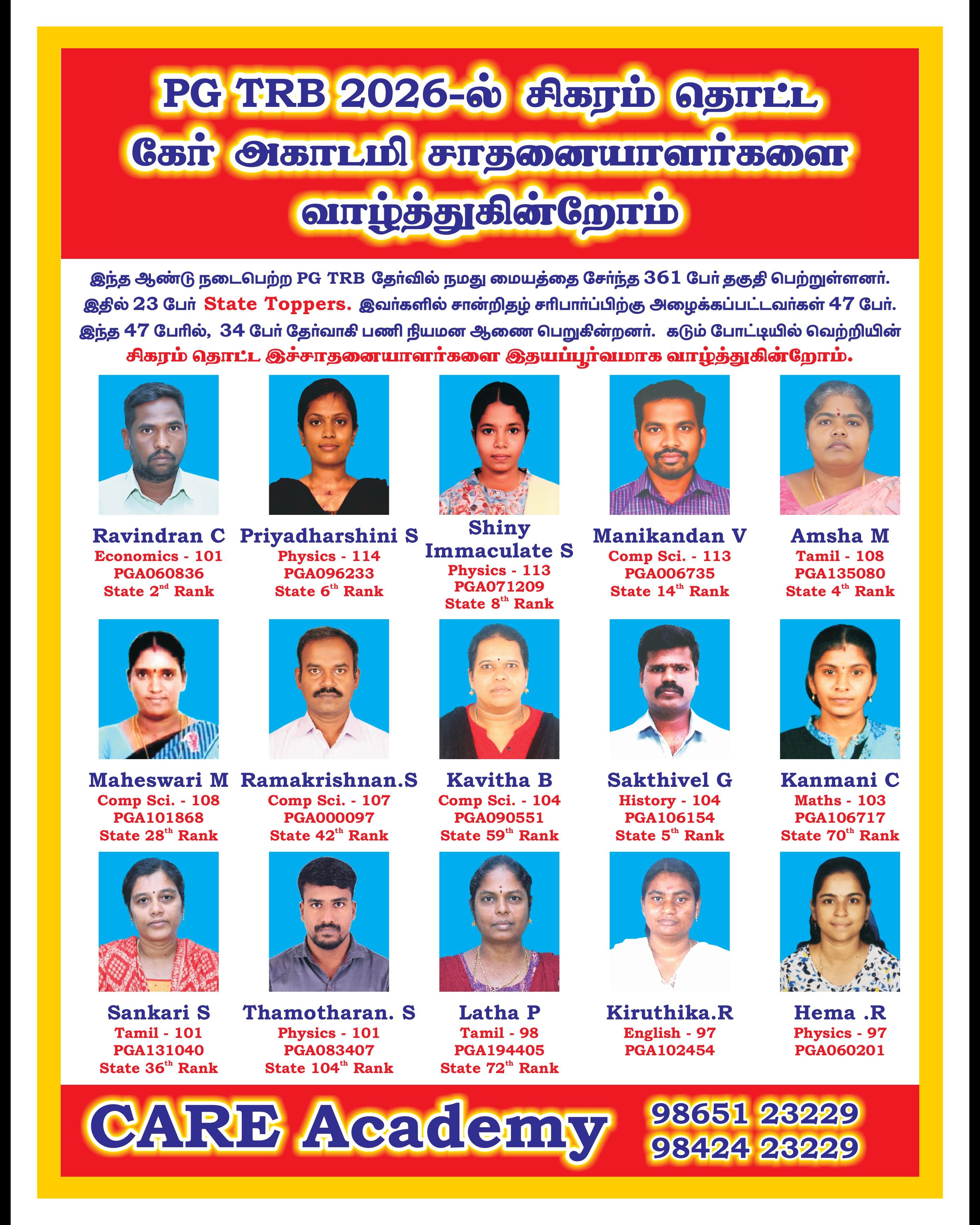 CARE Academy in Tiruchirappalli is a dedicated coaching and educational institute offering specialized preparation for the PG TRB (Post Graduate Teacher Recruitment Board) examination. The centre provides comprehensive coaching tailored to the PG TRB syllabus, with a strong focus on core concepts, detailed subject coverage, regular practice questions, and strategic mock tests to enhance exam readiness. Students benefit from experienced faculty who deliver structured lessons, personalized feedback, and doubt-clearing sessions to strengthen understanding and boost confidence.