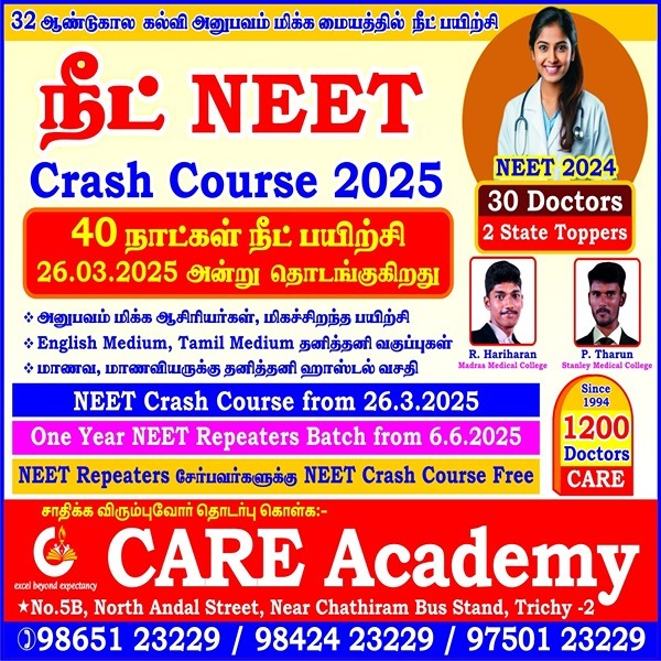 Care Academy Ranked among the top NEET coaching centres in Trichy, we provide a competitive edge to our students through expert guidance and comprehensive study materials.