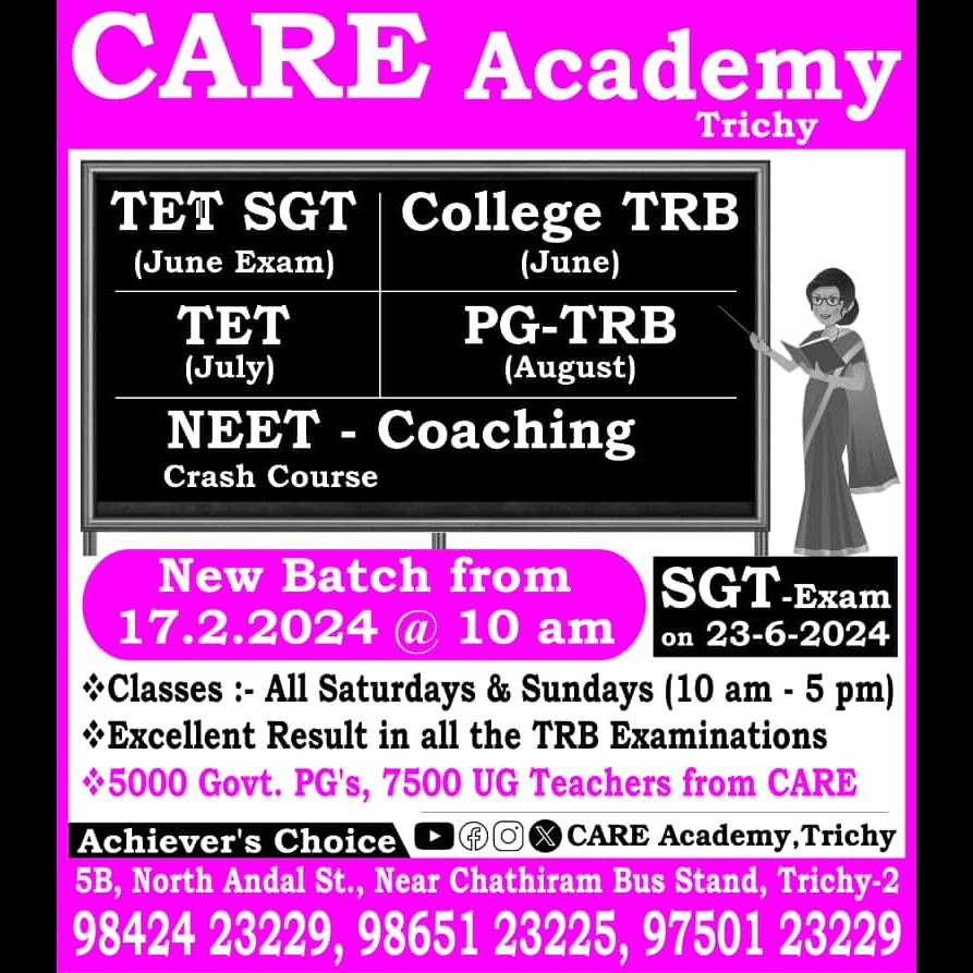 Care Academy If you're seeking a dedicated TRB coaching centre in Trichy, look no further. We offer focused and effective coaching programs designed to help you clear the Teachers Recruitment Board examinations with confidence.